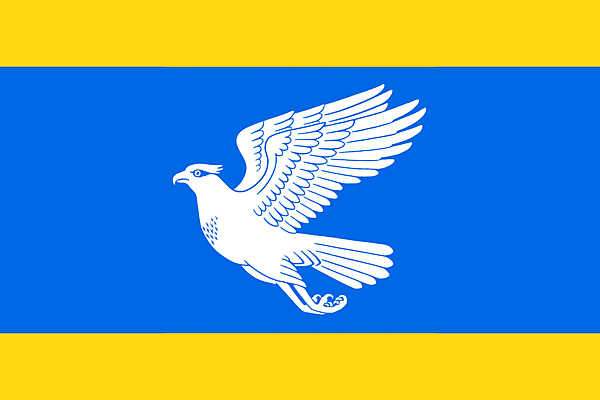 Полотнище с соотношением сторон 2:3, разделённое на три горизонтальные полосы. Средняя голубая полоса составляет 4/6 высоты полотнища, нижняя и верхняя жёлтые полосы равны 1/6 высоты полотнища каждая. В центре голубой полосы белое изображение летящей скопы.