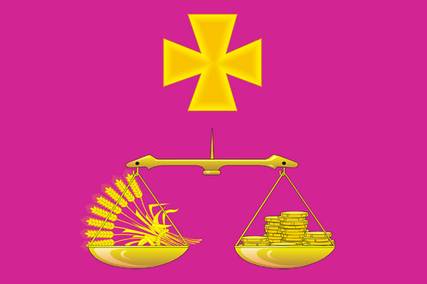 «Полотнище малинового цвета с отношением ширины к длине 2:3, несущее посредине жёлтые изображения, сверху — креста с уширенными концами, снизу — весов с пуком пшеничных колосьев в чаше от древка и монетами в чаше к свободному краю полотнища. Размер креста составляет 1/3, а весов 1/2 от ширины полотнища».