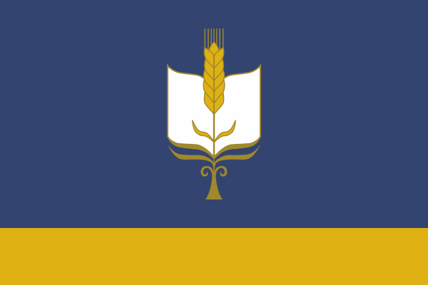 «Прямоугольное полотнище с соотношением ширины к длине 2:3, состоящее из двух горизонтальных полос: верхней синего цвета шириной 4/5 ширины полотнища и нижней жёлтого цвета; в центре синей полосы раскрытая книга белого цвета, поверх которой хлебный колос на длинном лиственном стебле жёлтого цвета».