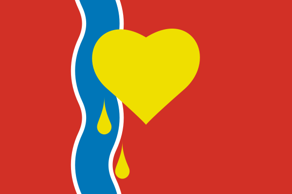 «Прямоугольное красное полотнище с отношением ширины к длине 2:3, несущее со смещением к древку голубую волнистую полосу, отделённую от красных частей полотнища белыми линиями. Габаритная ширина полосы (с белыми линиями) составляет 1/7 от длины полотнища. Посередине полотнища, со смещением вверх, расположено жёлтое изображение сердца; под ним со стороны древка воспроизведены две жёлтые падающие капли — одна на фоне полосы, другая на большей красной части».