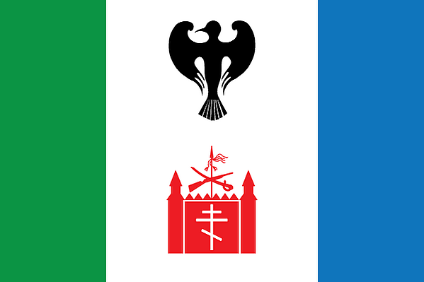 «Прямоугольное полотнище с отношением ширины к длине 2:3, воспроизводящее композицию герба Тигильского муниципального района в белом, зелёном, синем, чёрном и красном цветах».