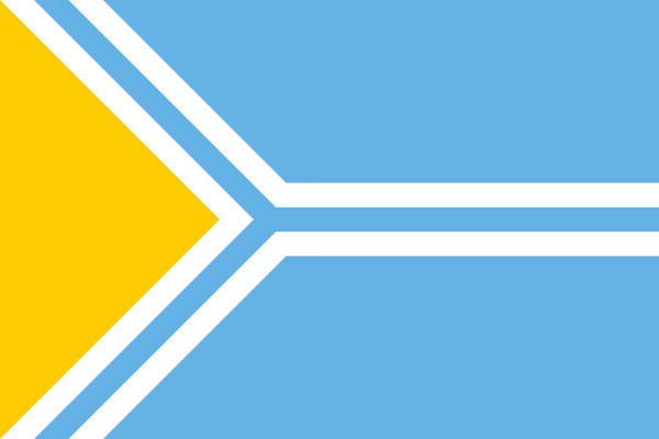 «Государственный флаг Республики Тыва представляет собой голубое прямоугольное полотнище. Со стороны древка, из верхнего и нижнего углов флага, исходят наклонные белые и голубые полосы. Голубые полосы образуют при соединении одну полосу, проходящую вдоль длины флага, по его середине. Параллельно ей, сверху и снизу, проходят белые полосы.