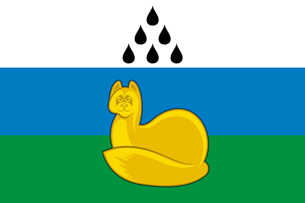 «Прямоугольное полотнище с отношением ширины к длине 2:3, составленное из равных горизонтальных полос белого, синего и зелёного цветов, несущее изображения фигур районного герба: посередине белой полосы — шести чёрных капель, посередине образованной синей и зелёной полосами части полотнища — соболя, выполненное жёлтым цветом. Оборотная сторона полотнища зеркально воспроизводит лицевую».