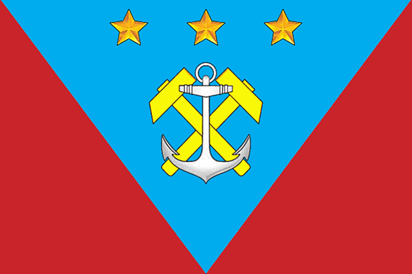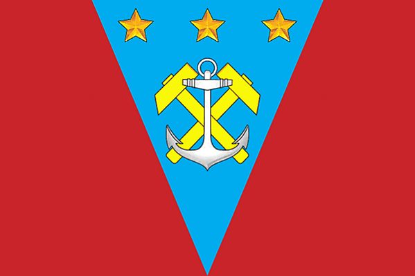 «Прямоугольное красное полотнище с отношением ширины к длине 2:3, с голубым равнобедренным треугольником, основанием примыкающим к верхней стороне полотнища, а вершиной — к нижней (ширина основания треугольника — 5/9 длины полотнища). На треугольнике воспроизведены жёлтым и белым цветом скрещённые молоты и якорь под тремя пятилучевыми звёздами».