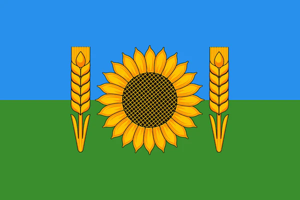 «Прямоугольное полотнище с отношением ширины к длине 2:3, состоящее из двух равных горизонтальных полос голубой и зелёной; по середине полотнища изображены жёлтый, с чёрными семенами, цветок подсолнуха между двумя жёлтыми колосьями».