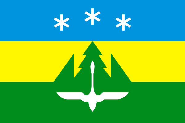 Флаг города — опознавательно-правовой знак, составленный и употребляемый в соответствии с вексиллологическими правилами, представляет собой прямоугольное полотнище с соотношением сторон 2:3, разделённое по горизонтали на три полосы равной ширины — голубую, жёлтую и зелёную, посередине полотнища зелёная полоса имеет выступ сложной формы, соответствующий фигурам городского герба — ели и обрамляющим её клиньям. Голубая полоса несёт в центре изображение трёх белых звездообразных фигур (снежинок), а зелёная полоса — белый силуэт летящего вверх стерха. Флаг города разработан на основании герба муниципального образования и воспроизводит его символику.