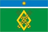 «Прямоугольное полотнище с отношением ширины к длине 2:3, состоящее из трёх горизонтальных полос, соотносящихся как 5:1:19, сверху вниз: голубого, белого и зелёного цветов; в центре верхней полосы — солнце жёлтого цвета с чередующимися прямыми и пламенеющими лучами (габаритный диаметр 1/6 ширины полотнища); в центре зелёной полосы — сквозной ромб жёлтого цвета (высотой 2/3 ширины полотнища), переплетённый с двумя скрещёнными по диагонали головками пшеничных колосьев жёлтого цвета».