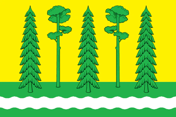 «Прямоугольное двухстороннее полотнище с отношением ширины к длине 2:3, разделённое по горизонтали на две части жёлтого и зелёного цвета (в отношении 7:3). В середине зелёной части полотнища — белая волнистая горизонтальная полоса (шириной 1/10 ширины полотнища), выше которой из зелени вырастают попеременно стоящие три ели и две сосны».