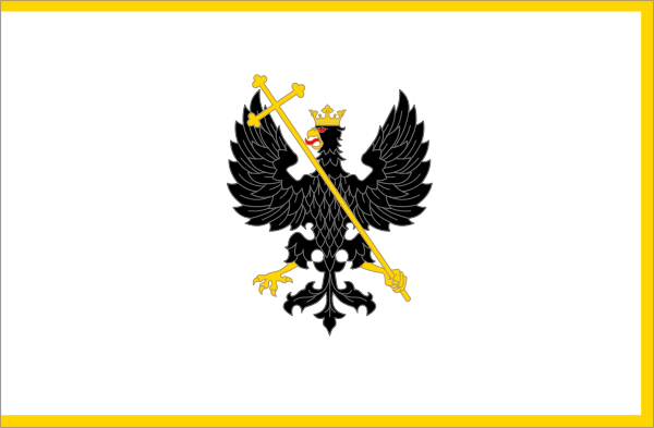 Флаг представляет собой прямоугольное серебряное со срезанной у древка золотой каймой полотнище с соотношением 2:3, в центре которого чёрный с золотым клювом и когтями и червлёными глазами и языком коронованный золотом орёл, держащий в левой лапе длинный золотой крест в перевязь.