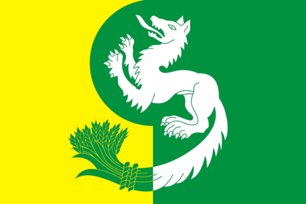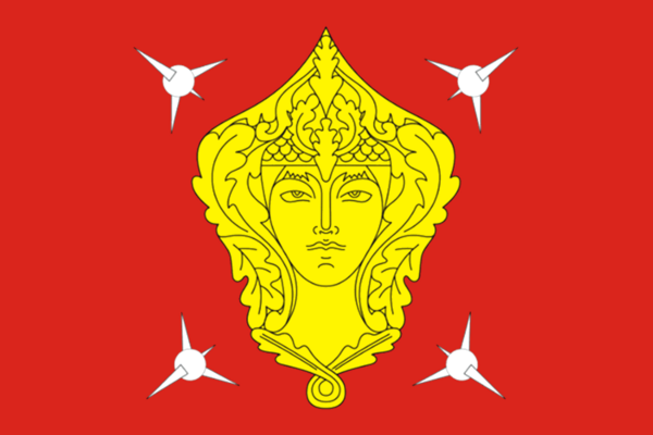 «Прямоугольное полотнище красного цвета с отношением ширины к длине 2:3, в центре которого скачущая к древку дева-всадница белого цвета в свободных развевающихся одеждах, простёршая обе руки вверх (правую к древку, левую от древка) и поддерживающая над головой подобный арке венок из двух головок хлебных колосьев жёлтого цвета».