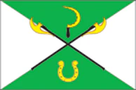 «Прямоугольное двухстороннее полотнище с отношением ширины к длине 2:3, диагонально разделённое волнистыми линиями на 4 части — верхнюю и нижнюю — зелёного, у древка и у свободного края — белого цвета. В центре верхней части — вертикально расположенный жёлтый серп с чёрной рукояткой, в центре нижней — вертикально расположенный жёлтый бердыш на чёрном древке. В центре пересечения диагоналей — голубой осётр, повёрнутый к древку».
