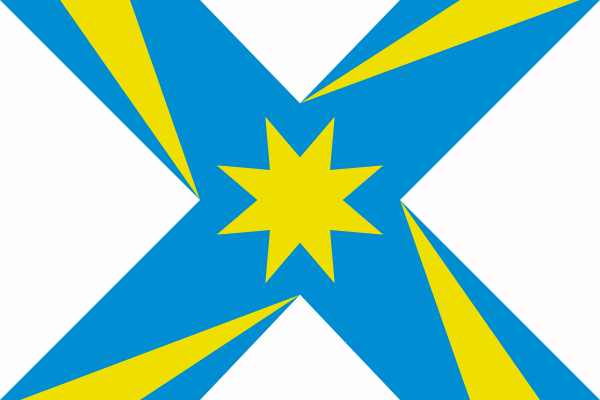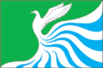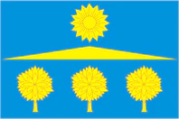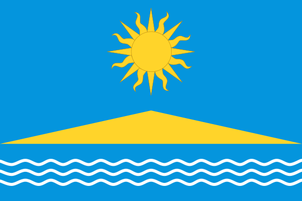 «Флаг представляет собой голубое полотнище с клинообразным жёлтым поясом по центру. Вверху жёлтое сияющее солнце. Внизу стоящие три жёлтых дерева. Отношение длины к ширине 3:2».