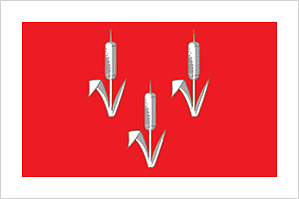 «Прямоугольное рубиновое полотнище с отношением ширины к длине 2:3, с белой каймой в 1/9 ширины полотнища, несущее посередине изображение трёх белых стеблей рогоза из герба муниципального образования».