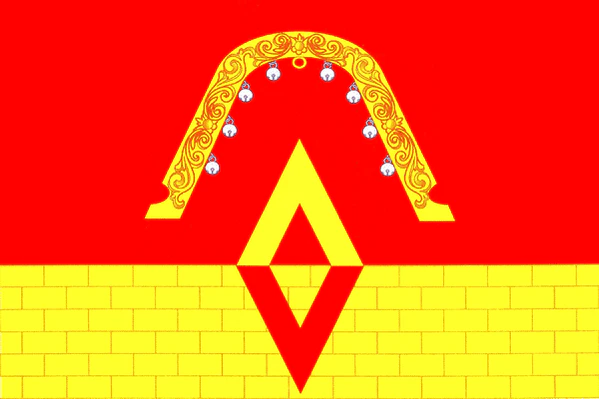 «Флаг представляет собой красное прямоугольное полотнище с отношением ширины к длине 2:3, несущее вдоль нижнего края жёлтую полосу 1/3 ширины полотнища, мурованную оранжевым, и воспроизводящее фигуры герба: посередине красной части жёлтую с белыми бубенчиками конскую дугу и под ней сквозной ромб, лежащий наполовину поверх полосы, сверху — жёлтый, снизу — красный».