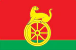 «Прямоугольное красное полотнище с отношением ширины к длине 2:3, несущее вдоль нижнего края зелёную полосу в 1/4 ширины полотнища. Посередине полотнища изображены фигуры герба: жёлтое железнодорожное колесо и сидящая на нём выдра того же цвета».