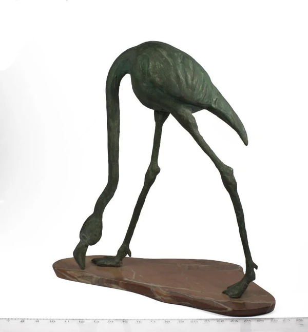 Скульптура воплощает образ птицы фламинго. Птица изображена с длинной шеей, наклонённой вниз в поисках пищи. Лапы широко расставлены, что создаёт динамику позы. Композиция проста, но удачно передаёт характерные черты животного. В работе заметна комбинация реализма и стилизации, что позволяет сохранить узнаваемость образа.