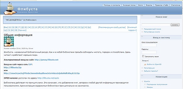flibusta.is flibusta.net (зеркало) flisland.net (зеркало, без доступа к текстам книг) Официальный сайт TOR |