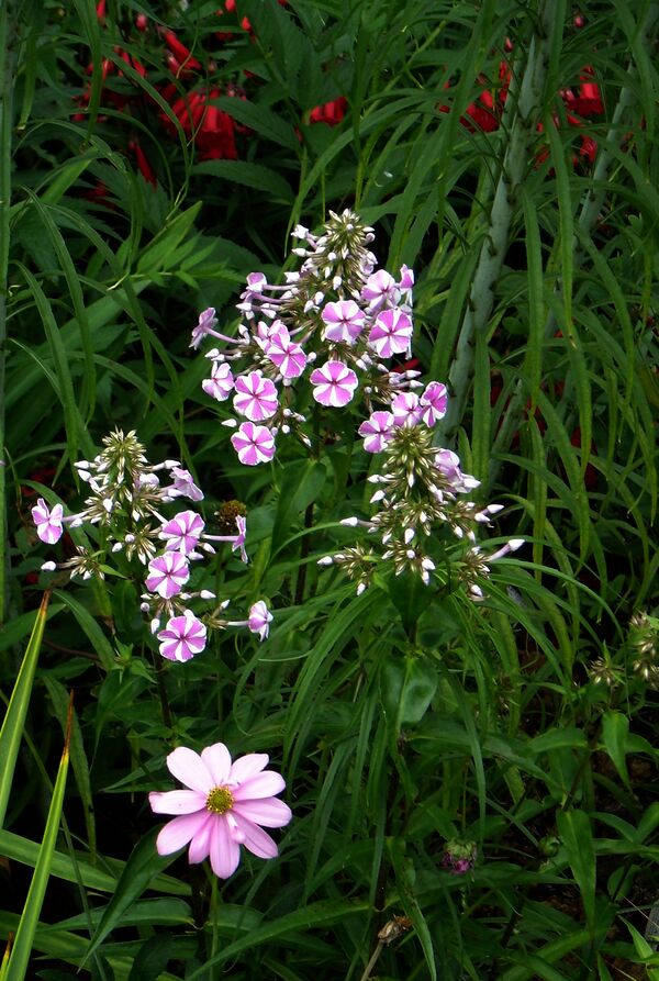 | Флокс луговой и его белая разновидность (Phlox maculata L. и Phlox maculata var. Candida Mid.) | Начало июля | Светло-пурпурные (цветки до 2 см в диаметре) | Вид образует рыхлые дернины, сложенные тонкими ветвистыми стеблями, стелющимися у основания и приподнимающимися у вершины. Листья узкие, длинные, почти шиловидные; |