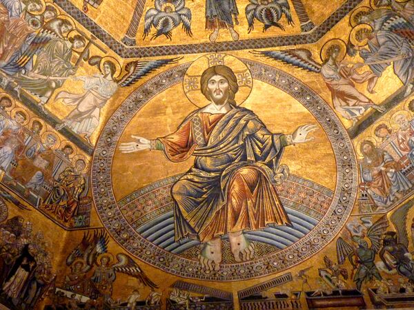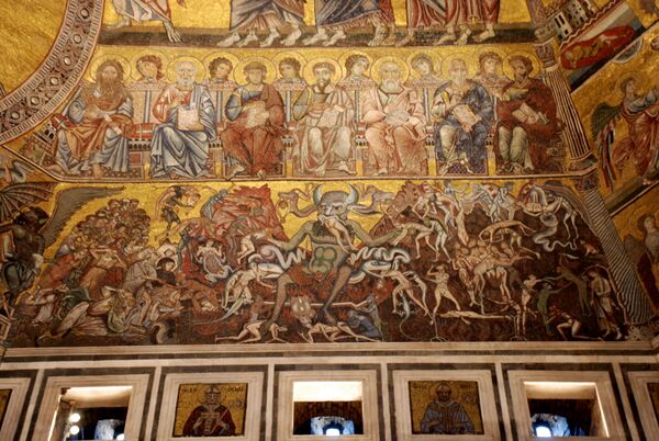 Восьмиугольный сегментированный свод в период между 1250 и 1330 годами украшен мозаиками в византийском стиле, на золотом фоне, под руководством францисканского монаха Якопо, с участием Андреа Тафи, Коппо ди Марковальдо, Чимабуэ, Гаддо Гадди и других мастеров. Центральная мозаика изображает картину Страшного суда с фигурой Христа в центре. В баптистерии также находится гробница антипапы Иоанна XXIII (работа Микелоццо ди Бартоломео и Донателло)[8].