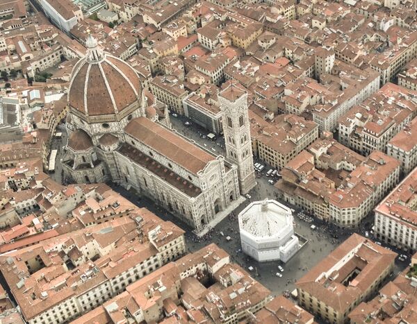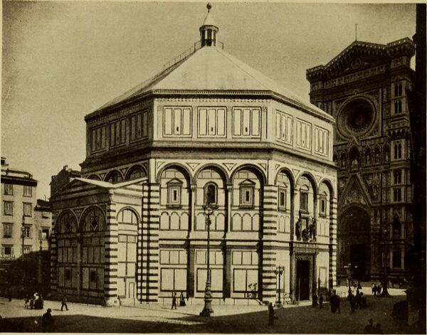 Вместе с кампанилой (колокольней) Джотто и Собором Баптистерий представляет собой часть единого монументального ансамбля. Ранее, расположенный на западной стороне Соборной площади, Баптистерий Сан-Джованни выполнял в этом ансамбле отграничивающую функцию, непосредственно примыкая с западной стороны к Епископскому дворцу. Поэтому он имел три двери: северную, восточную и южную, а с запада — апсиду. Однако в XIX веке логика ансамбля была нарушена тем, что площадь позади Баптистерия была расширена, и он оказался в её центре. Архитектор и теоретик искусства Адольф фон Гильдебранд негодующе писал о столь пагубном решении, в результате которого зрительно потерялась сама площадь, а загромождающее здание Баптистерия стало похожим на «оставленный не на своём месте шкаф», он стал «бессмысленным: на него натыкаешься, как на препятствие, и непосредственное впечатление от собора уничтожается»[7]. В середине XII века здание было облицовано плитками разноцветного мрамора геометрического рисунка различных оттенков: белого мрамора (из Каррары) зелёного (из Прато) и розового (из Мареммы) — так называемый инкрустационный стиль, типичный для архитектуры средневековой и ренессансной Тосканы. Полукруглая апсида в XIII веке была заменена на слегка выступающую за пределы здания прямоугольную скарселлу (итал. scarsella — мешочек, кошелёк). Пол инкрустирован мрамором в 1209 году.