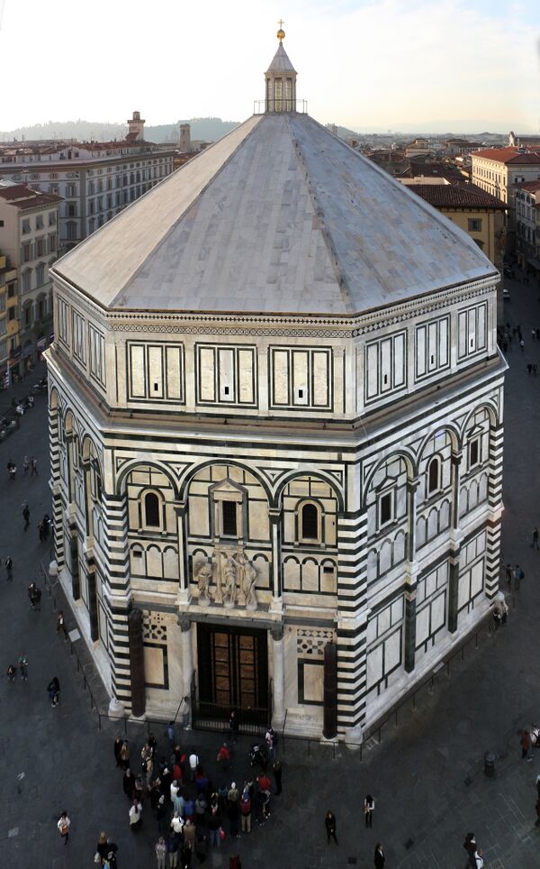 Баптистерий построен в виде октогона — центрического, восьмигранного в плане сооружения 25,60 м в поперечнике. Это давняя традиция античной, мусульманской и раннехристианской архитектуры[5]. Помимо конструктивной прочности восьмигранных сооружений, в христианстве числу «восемь», придавали символическое значение: восьмой день после семи дней творения — «конец времён» и воскрешение к вечной жизни, которое даёт таинство крещения. Число восемь символизирует также соединение четырёх земных и четырёх небесных начал, поэтому восьмигранными делали крещальные купели и в форме октогона строили баптистерии, мартириумы, санктуарии (святилища), мавзолеи[6].