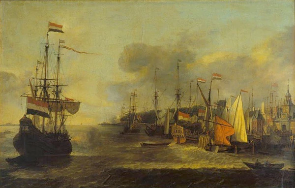 Как следует из авторского указания, картина написана в 1642 году и скорее всего изображает конкретное историческое событие, однако какое именно событие показано — точно не установлено. В каталогах и описях Эрмитажа за XIX век картина значилась под названием «Прибытие принца Оранского во Флиссинген», однако в крайнем справа обрезанном береговом строении опознаются роттердамские городские ворота Ауде Хоофдпорт и таким образом первоначальная атрибуция сюжета оказалась неверной. Нидерландский исследователь Я. Кельх выдвинул гипотезу о том, что изображена торжественная встреча принца Виллема II по возвращении его из визита в Лондон на флагманском корабле «Aemilia» в июне 1641 года, но он же сам и опроверг своё предположение отметив что принц вернулся в Нидерланды через Хеллевутслёйс, а не через Роттердам[2].