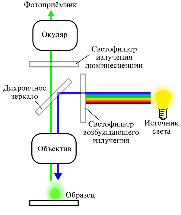 Во флуоресцентном микроскопе образец облучается светом с большей частотой, а изображение получают в оптическом спектре. Излучение образца, соответственно, пропускается через фильтр, отсекающий свет на частоте возбуждения. Изображение флюоресцентного препарата может быть сфотографировано специализированной цифровой камерой, позволяющей делать снимки с большой выдержкой. Для некоторых изображений это время может достигать 60 минут.