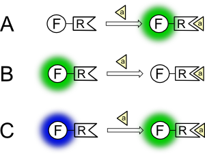 Флуоресцентный зонд может по-разному изменять флуоресценцию при связывании с аналитом, что схематично показано на рисунке: флуоресценция может расти (случай А), угасать (В) или полностью изменить один из параметров, например, цвет (случай С).