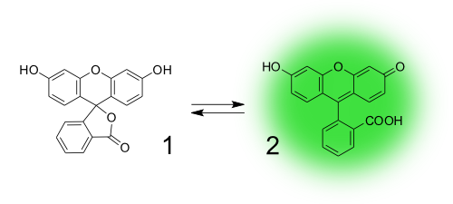 Другой особенностью малых органических флюорофоров является то, что их флуоресценцию можно «включать» с помощью минимальных изменений в химической структуре. Это широко используется в создании флуоресцентных зондов на основе таких молекул. Примером является флуоресцеин, который может существовать в форме двух таутомеров: в нефлуоресцентной лактонной форме и флуоресцентной открытой форме.