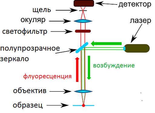 Для флуоресцентной микроскопии необходимы микроскопы специальной конструкции[105]. Сильно упрощённая схема такого микроскопа (а именно схема растрового конфокального эпифлуоресцентного микроскопа) показана на рисунке. Он имеет следующие особенности строения[11][105]: