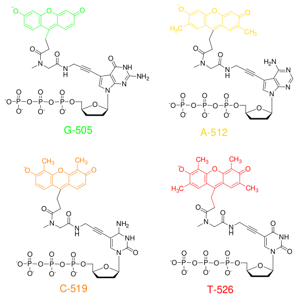 Метод секвенирования с дидезокситерминаторами был существенно усовершенствован, когда радиоактивное мечение праймера было заменено на флуоресцентное мечение терминальных нуклеотидов. На рисунке показана структура дидезоксинуклеозид-трифосфатов, которые содержат флуоресцентные красители, привязанные ковалентными связями к азотистым основаниям. Было обнаружено, что такие модификации азотистых оснований минимально влияют на распознавание трифосфатов ДНК-полимеразами, поэтому они могут встраиваться в синтезированную ДНК наряду с обычными дНТФ. В случае с флуоресцентными дидезокситерминаторами при терминации синтеза ДНК происходит её флуоресцентное мечение. Использование флуоресцентных красителей четырёх цветов для кодирования каждого из природных нуклеозидов позволило проводить синтез в одной пробирке и разделение на одной дорожке геля. Более того, флуоресцентная детекция оказалась более чувствительной и быстрой по сравнению с радиоактивной, позволяя проводить определение нуклеотидов в реальном времени.