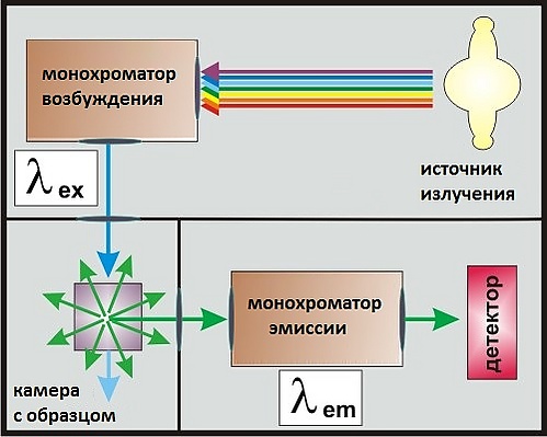 Основными приборами для изучения флуоресценции в лабораторных условиях являются спектрофлуориметры[12]. Сильно упрощённая схема такого прибора показана на рисунке. В спектрофлуориметрах используют различные источники света, чаще всего ксеноновые лампы высокого давления. Они дают широкий спектр эмиссии (от ультрафиолетового до инфракрасного света). Излучение от лампы поступает к монохроматору возбуждения, который даёт на выходе свет с определённой нужной длиной волны . После этого монохроматический луч направляется на образец, вызывая его флуоресценцию. Важным является то, что флуоресцентная эмиссия изотропна, то есть её интенсивность одинакова во всех направлениях (не зависит от угла, под которым она наблюдается). Это даёт возможность легко отделить её от возбуждающего света. Расположение детектора под углом 90° к направлению возбуждения даёт возможность улавливать исключительно те фотоны, которые являются результатом флуоресцентной эмиссии. Флуоресцентный свет пропускается сквозь ещё один монохроматор (монохроматор эмиссии, ). После этого интенсивность светового потока измеряется с помощью детектора.
