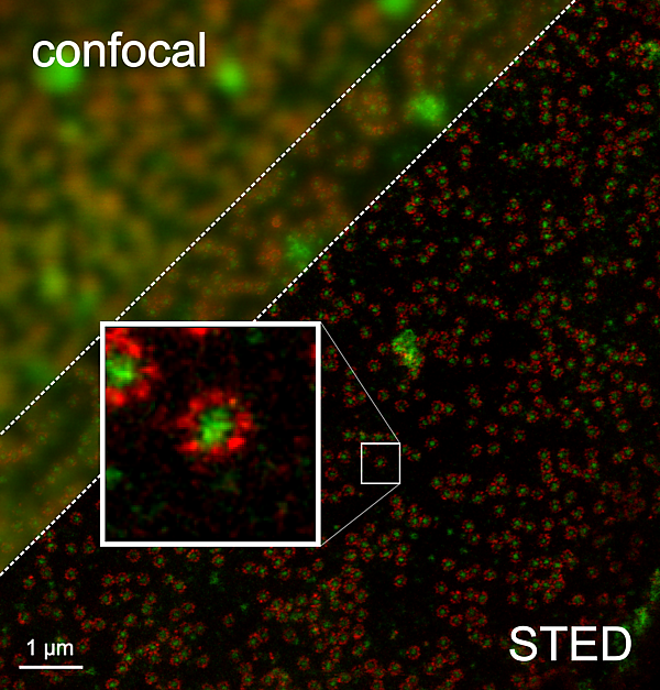 Благодаря этому была уменьшена площадь, с которой регистрируется флуоресценция, а следовательно, повышено пространственное разрешение метода. На фотографии слева показаны для сравнения два изображения одного и того же объекта, сделанные с использованием растровой конфокальной и STED-микроскопии.