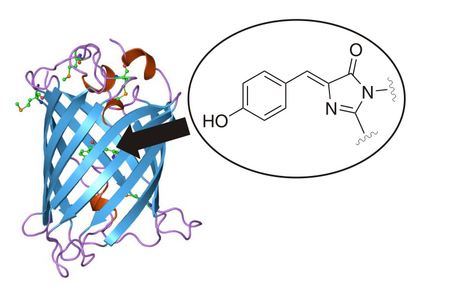 Важной группой флюорофоров являются флуоресцентные белки. Первый представитель этого класса — зелёный флуоресцентный белок (ЗФБ) — был выделен из медузы Aequorea victoria в 1962 году[47]. Это относительно небольшой белок с молекулярной массой 27 кДа, который поглощает синий свет и флуоресцирует зелёный.