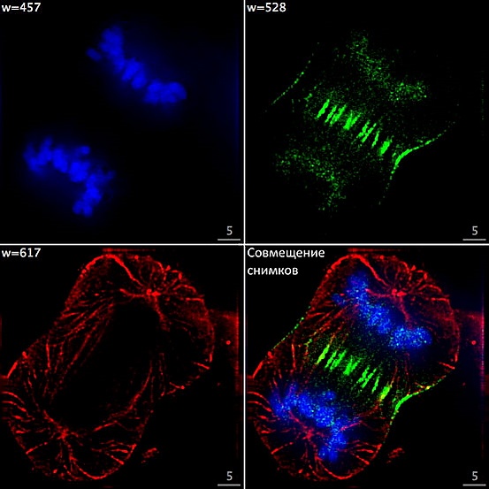 - Качество изображений существенно улучшается при использовании конфокальных флуоресцентных микроскопов. В таких микроскопах на пути флуоресцентного света устанавливается щель, через которую удаётся наблюдать флуоресценцию только от той части образца, которая находится в фокусе изображения. С помощью конфокальных флуоресцентных микроскопов можно изменять глубину проникновения в клетку, наблюдая за отдельными её «срезами» (физически клетка остаётся целой). Это также позволяет сделать трёхмерную реконструкцию клетки, накопив достаточное количество оптических «срезов».