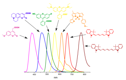 Цвет флуоресценции малых органических красителей может варьироваться в очень широких пределах. Так, например, производные кумарина и флуоресцеина имеют синюю и зелёную флуоресценцию соответственно. Производные родамина и BODIPY могут иметь жёлто-красную флуоресценцию, тогда как на базе цианинов и скваринов созданы красители, которые флуоресцируют в красном и ближнем инфракрасном цвете. Флуоресценцией красителя можно управлять, изменяя природу функциональных групп, присоединённые к флюорофору[34].