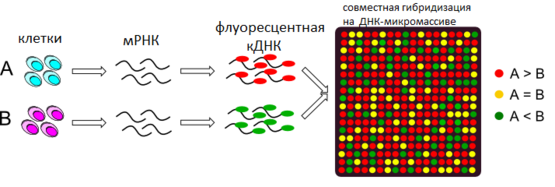 Клетки обоих образцов обрабатывают специальными химическими реагентами и экстрагируют матричную РНК, которая содержится в цитоплазме. РНК каждого образца инкубируют в присутствии обратной траскриптазы и флуоресцентных маркеров определённого цвета, в результате чего образуются флуоресцентно-меченые молекулы кДНК. Так, например, на рисунке, кДНК образца А была помечена красным флюорофором, а кДНК образец В — зелёным. После этого образцы смешивают и гибридизируют на микромассиве. В результате молекулы кДНК гибридизируются в ячейке, которая соответствует их гену. Анализ цвета флуоресценции в каждой ячейке показывает разницу в уровне экспрессии соответствующего гена в обоих образцах. Если ячейка имеет красный цвет, это значит что при гибридизации раствора на микромассиве в нём содержалось больше кДНК из клеток, А, следовательно уровень экспрессии гена в клетках А был более высоким. Если ячейка имеет зелёный цвет, значит уровень экспрессии был выше в клетках В. Наконец, жёлтый цвет свидетельствует о том, что клетки содержали одинаковое количество мРНК, следовательно уровень экспрессии этого гена у них был одинаковый[96].