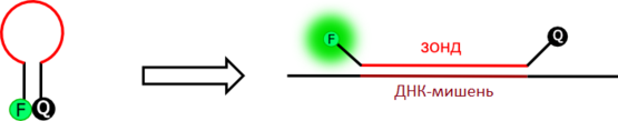 «Молекулярный маяк». Переход закрытой нефлуоресцентной формы (слева) в открытую флуоресцентную (справа) происходит в присутствии ДНК-мишени. F = флюорофор; Q = гасители флуоресценции