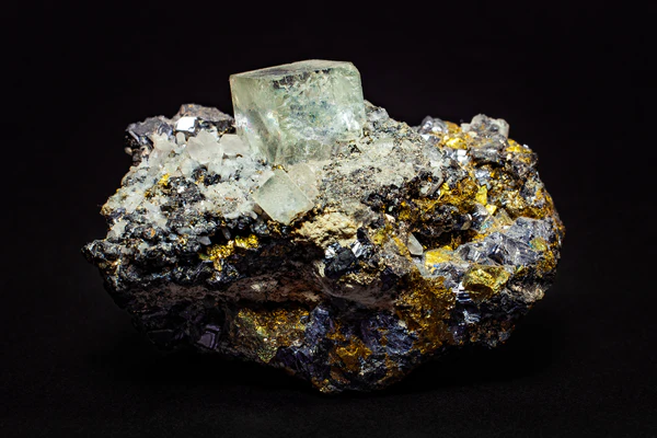 В ассоциации с флюоритом можно встретить кварц, галенит, сфалерит, халькопирит, марказит, кальцит, доломит, гипс, целестин, барит, тетраэдрит, серебросодержащие минералы, молибденит, апатит, топаз, турмалин.