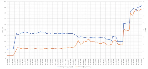- на отдельных счетах по учёту средств ФНБ в Банке России размещено порядка 15 млрд долл. США, 15 млрд евро, 3 млрд фунтов стерлингов;