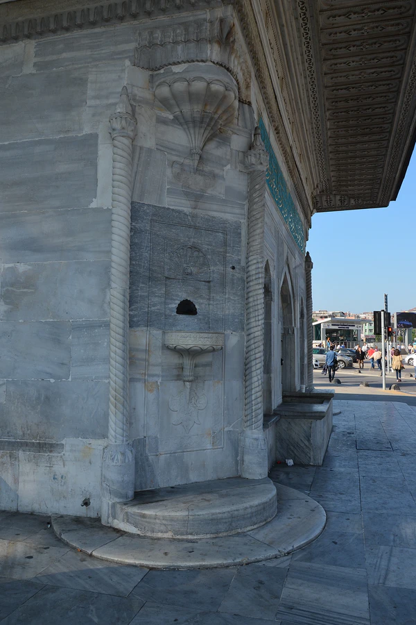Фонтан оснащён кранами внутри стрельчатой арки в середине каждого фасада над поилкой, позволяющими наполнять ведра, поить скот или совершать ритуальное омовение тела для молитвы. Краны, расположенные выше над раковиной на четырёх угловых фасадах, были предназначены для подачи питьевой воды людям. В стене главного фасада, смотрящего на Босфор, с обеих сторон есть две полукруглые ниши, напоминающие михраб мечети. Фонтан украшают рельефные цветочные мотивы: тюльпаны, розы и хризантемы в вазе. Каждый из восьми углов фонтана обрамляет соломоновы колонны, увенчанные коринфскими капителями. В верхней части угловых фасадов между колоннами находятся мукарны, трансформирующие восьмиугольное в плане сооружение в квадратное прямо под крышей. Карниз деревянной крыши украшен резными украшениями, располагаясь над карнизом, опоясывающим всю конструкцию фонтана[2][3][4][5][6][8][9][10].