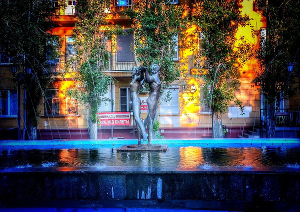 Скульптура отлита из бронзы и изображает юношу и девушку, которые стоят спиной друг к другу, держась за руки. Между фигурами пробивается фонтан.