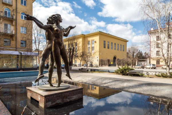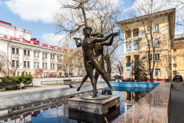 До 1960-х годов на этом месте, напротив экспериментального театра, стоял фонтан «Каменный цветок» на тему уральских сказов Бажова. В середине фонтана возвышался тот самый каменный цветок, рядом с ним фигура Данилы-мастера с резцом и молотком в руках, в холщовой рубахе, схваченными ремешком. А по контуру фонтана располагались несколько крупных лягушек, с которых в воду любили скатываться дети. По вечерам сооружение подсвечивали разноцветными лампами[2][3].