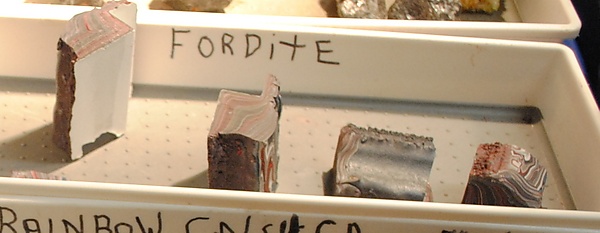 Фордит, или детройтский агат (оба названия неформальные), представляет собой старую автомобильную краску, которая затвердела в достаточной степени, чтобы быть огранённой и отполированной[1][2]. Этот материал образовывался при наращивании слоев эмалевой краски на стойках и полозьях, на которых автомобили окрашивались вручную с помощью распылителей (ныне этот процесс автоматизирован); слои краски затвердевали при многократном прохождении стоек через печи, в которых высушивались покрашенные автомобили[3]. Фордит перерабатывается и используется для изготовления украшений[4].