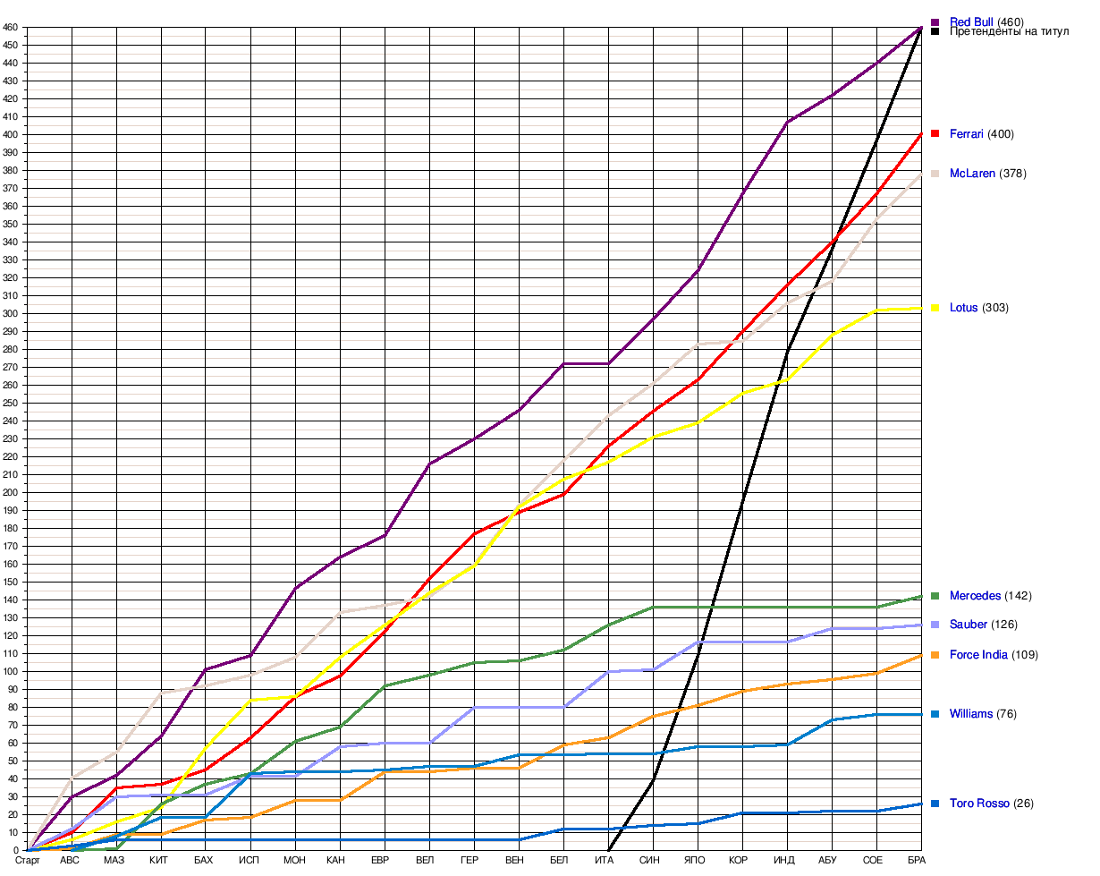 | 1 | Red Bull | RB8 | Renault | 40 | 35 | 7 | 14 | 8 | 7 | 460 |