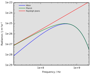 Пользуясь соображениями классической физики, в 1900 году лорд Рэлей, а в 1905 году Джеймс Джинс вывели закон Рэлея — Джинса. К такому же результату, независимо от них, приходил в своих работах и сам Планк. Вывод этого закона мало отличался от вывода закона Планка (см. ниже), за исключением того, что средняя энергия излучения была принята равной , согласно теореме о равном распределении энергии по степеням свободы. С точки зрения классической физики ход вывода не вызывал сомнений, однако закон Рэлея — Джинса не только серьёзно расходился с экспериментальными данными везде, кроме длинноволновой области, но и предсказывал бесконечно большую мощность излучения на коротких волнах. Этот парадокс указал на то, что в классической физике всё же имеются фундаментальные противоречия, и стал дополнительным аргументом в пользу квантовой гипотезы. Пауль Эренфест в 1911 году впервые назвал его ультрафиолетовой катастрофой[6][15][21].