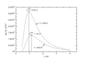 Закон смещения Вина связывает длину волны, на которой излучательная способность абсолютно чёрного тела максимальна, с его температурой. Он выводится из закона Планка дифференцированием его по частоте или длине волны, в зависимости от формы записи, и приравниванием производной к нулю, который достигается в максимуме функции. При этом получается соотношение , где — константа, равная 0,0029 м·K. Таким образом, при увеличении температуры длина волны максимума уменьшается[29].