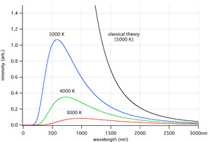 Однако дальнейшие эксперименты показали, что закон излучения Вина неточно описывает спектр теплового излучения в длинноволновой области. В октябре 1900 года Планк представил формулу, которая с точностью до констант совпадала с современным законом Планка. В тот же день было выяснено, что формула хорошо описывает экспериментальные данные, но при этом она не имела под собой теоретической основы. Планк вывел её лишь на основании того, что в предельном случае для коротких волн она должна переходить в закон Вина, но, в отличие от него, согласовываться с экспериментальными данными для длинных волн[18].