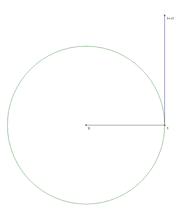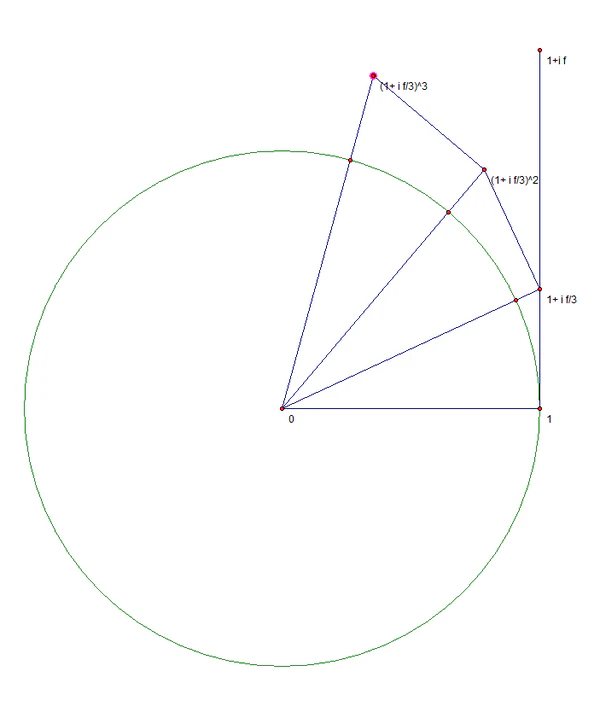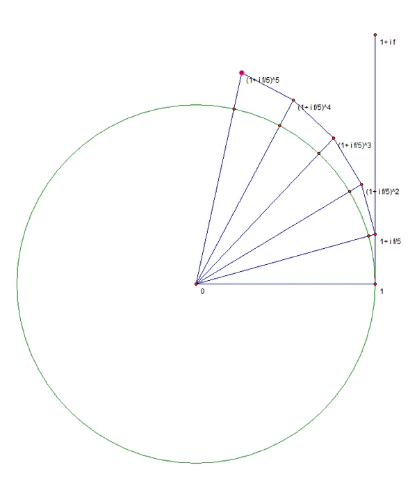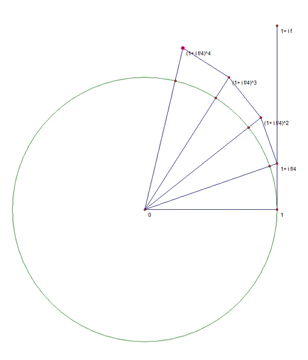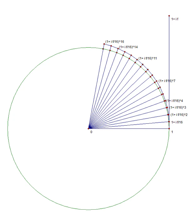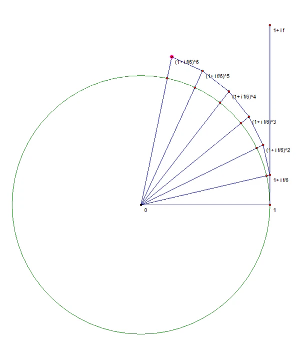 Известно, что . Нижеследующие изображения иллюстрируют, что предел равен точке, находящейся на единичной окружности, и длина дуги от этой точки до точки 1 равняется . Это, в частности, связано с тем, что .