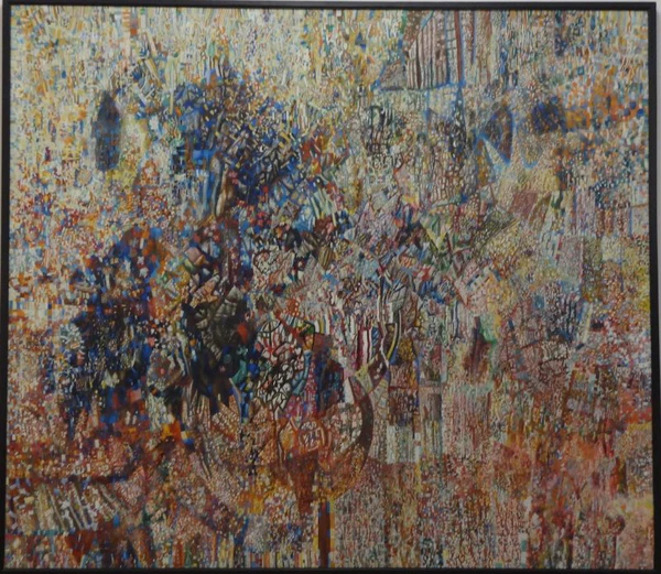 Работа представляет собой яркую мозаичную композицию, выполненную в стиле абстракционизма. Из множества мелких цветовых пятен и плоскостей формируется динамичное пространство, через которое снизу вверх проходят несколько извилистых линий. В отдельных участках просматриваются очертания шаров, что придаёт работе черты геометрического абстракционизма. В центре композиции выделяется голубовато-розовое пятно.